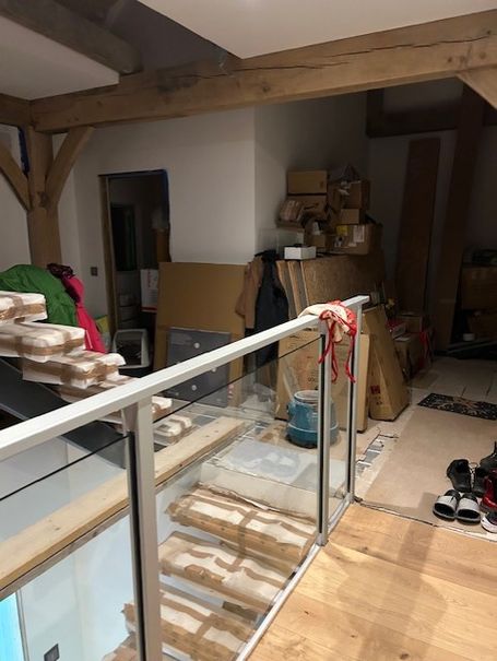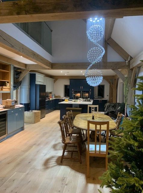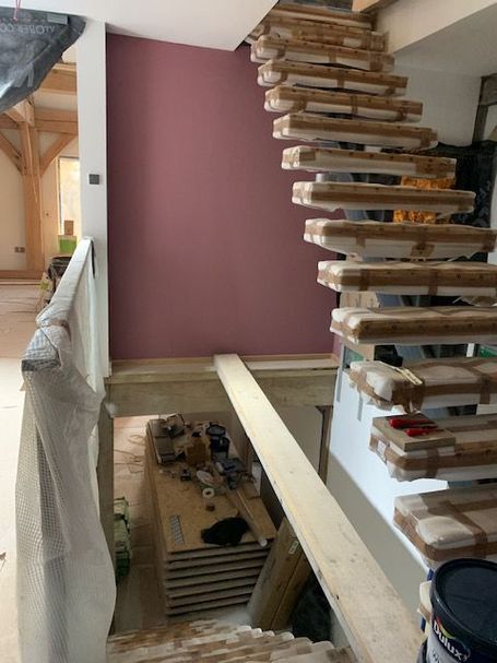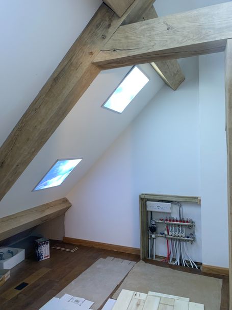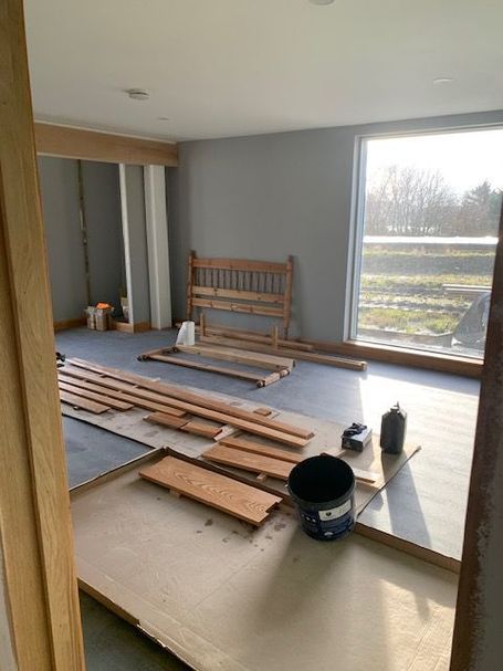 Balcony steel frame needs to be cut and welded. The glass balcony surround is purchased and waiting on these steel support rails being assembled. First fix wiring and plumbing is complete, Heat Pumps are plumbed and ready to be commissioned to provide our hot water & heating. Car Port footings are laid, pillars & pad to be concreted prior to Oak Roof Support Frame to be erected & roof waterproofing & slates to be installed. Oak frame sanding still to be completed, as there is a lot of it !