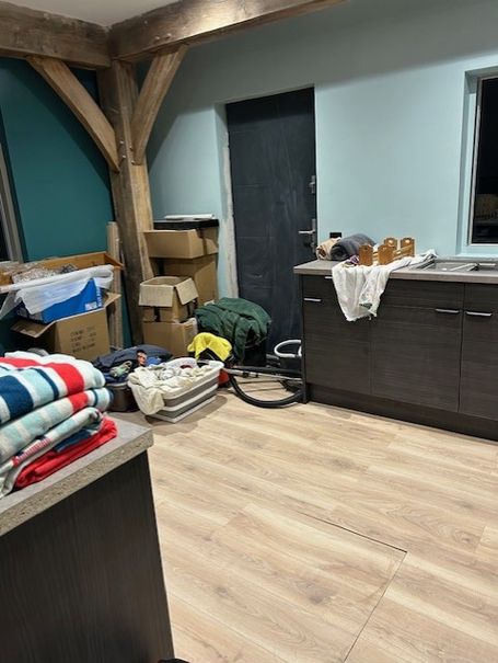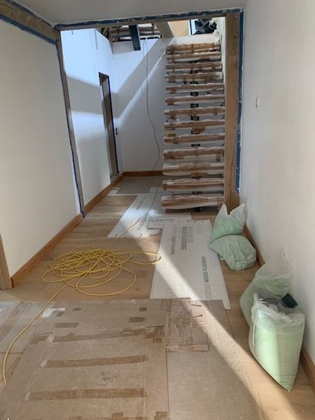 Main entrance door is fully fitted and we are now all secure. Cellar Staircase trapdoor created, welded and installed. Plastering of walls completed and kitchen/dining/lounge flooring is laid..