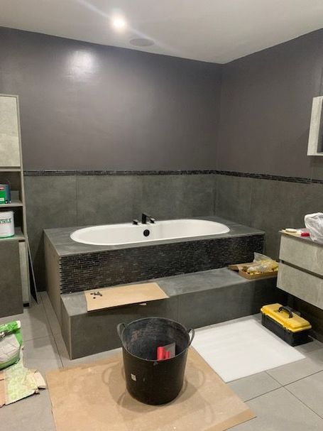 Tiling of other bathrooms has started, First Floor En-Suite is tiled and flooring is laid, just needs walls finishing then shower & bath can be fully sited and installed